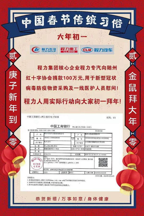 “各位程力家人,今年除夕我就不給大家發紅包了,我代表大家向隨州紅十字會捐獻100萬元!贝竽瓿跻唬程力汽車集團董事長程阿羅的一則微信刷爆隨州人的朋友圈,他說,這是所有程力人的心意,將專項用于隨州新型冠狀病毒感染肺炎防治物資保障和醫護人員慰問。