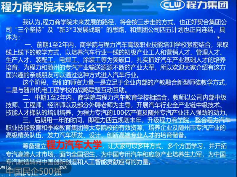 2020年確是一個不同尋常的一年,一場新型冠狀病毒感染的肺炎疫情席卷全國,牽動著億萬國人的心。湖北程力作為中國民營500強企業,公司領導多次為隨州捐款,捐物。為隨州百姓做貢獻。在疫情期間程力商學院組織各專業廠技術專家講師為程力汽車銷售經理提供釘釘在線網上產品業務知識培訓學習。下面是程力汽車集團公司總經理董事長程阿羅在程力商學院開播致辭網路連線圖片: ![]() 總經理在會上闡述: A:什么是程力商學院? 程力汽車集團股份有限公司的主要四大業務矩陣,即:汽車、金融、教育、投資。 這四大產業矩陣中,汽車是涵蓋專用汽車、商用車、新能源汽車、客車、汽車零部件,微卡、輕卡、中卡、重卡、皮卡底盤及整車的研發生產與銷售,以及應急專用汽車的產業全方位產業建設、配套與生產營銷。 金融作為企業發展的血脈,也主要是圍繞著以汽車產業進行匹配和支撐;第三個增長極,就是我們的教育矩陣,這也是為程力的汽車產業,乃至為隨州作為中國專汽之都的大工業,做汽車產業基礎人才培訓和高端研發設計、營銷人才的孵化提升;當然,作為資本的逐利的本質屬性,公司也會對前瞻性、新興高科技產業和國家鼓勵的戰略性支柱產業做適當的投資。 明白了這些思路,我們就可以很好的理解什么是程力商學院了。 簡單的講,程力商學院就是以汽車研發生產銷售為主要內容,進行學習交流的職業教育平臺,它分為線上網絡直播課堂學習及線下實體培訓學習的兩種方式,商學院匯聚了社會各界的專家、教授,智囊、企業家、行業泰斗、營銷精英及政商高端人才,是汽車產業發展的知識寶庫和動力源泉,商學院從2018年籌建上線,至今已2年 B: 程力商學院干什么? 程力商學院要干的事情歸納為:寬闊的胸懷、廣闊的視野,用金字塔理論歸結為: 一、塔底基礎性汽車產業大軍的培育,以程力汽車集團一線工人及隨州專汽產業技術的培訓為重點,以提升從業人員職業技能為主導,抓好產品生產環節。 二、塔身部位以培訓汽車銷售精英及團體人才梯隊為主,讓銷售人才專業化、職業化,網絡化(新媒體)、多樣化,為整個隨州培養一批誠信、自律、專業高效的營銷人才隊伍,把程力集團作為最好的實踐和自我提升的基地,把程力作為最好的創業平臺。 三、金子塔尖的高端研發、設計人才的孵化,商學院將建立汽車高端人才數據庫,為程力及隨州專汽產業和應急產業儲備人才,抓好原創和科研創新環節。 以上三個方面,我簡單的總結為:程力商學院就是干好“生產、銷售、研發'這六個字所涉及的內容,讓這三大區塊鏈有機緊密結合起來,相互促進協調發展。 C程力商學院未來干什么? ![]() 公司總經理程阿羅對商學院的殷切希望 ![]() 程力商學院網上第一期(疫情期間)培訓學習結束語: “沉舟側畔千帆過,病樹前頭萬木春”,走過黑暗我們必將迎來光明;走過黑暗我們必將更加美好!疫情帶給我們暫時的困難,只要我們不忘初心任重道遠堅如磐石,我們一定會更加眾志成城逆勢而上再創佳績。 大家一定要知道,疫情過后,國家一定會加大投資,未來五年,將是創業者最佳的機會,所以現在大家就要加強學習,為隨時迎接經濟繁榮、市場擴大做好準備。 程力一定要為有準備者提供最好的創業平臺,只要你有夢想、無論你是想帶團隊做銷售還是想帶團隊成為專業廠做專業產品,程力的三個廠區都能為你帶來最好的創業環境,或者自己有廠房想加入程力,程力一定為你提供最好的服務團隊,最大的銷售市場,最響亮的品牌,一定幫你實現你的夢想,沒有什么不可實現,只怕你不去一點點學習,在程力找到自己的定位然后再突破。 同志們,我相信有了程力商學院和大家共同進步,大家的夢想都一定能實現。 程力汽車集團2020年3月8日 |