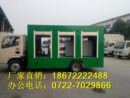 污水處理車采用東風福瑞卡底盤,底盤配置為:3.3米軸距、7.00-10尼龍胎、3噸后橋、1.5噸前橋、5檔變速箱及汽剎。整車長度為5.995米、寬為1.99米,高為2.65米。污水處理車外部設計有6個卷拆門和4個垃圾廂。后部采用雙開門和LED廣告宣傳牌,便于操作和宣傳。