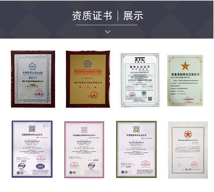 多樣│滿足各種專汽需求 專用車產業細分產品眾多,每個產品的市場格局由于行業門檻和市場特征的不同具有較大差異。隨著高等級公路的建設、物流市場的逐漸成熟,以及國內大量基礎設施建設,專用汽車產品結構較過去有了很大變化,重型車和輕型車比例處于增長趨勢,中型車比例繼續下降;體現專用功能特性的產品比重加大;種數得到大幅增加,產品結構更加合理。 程力主要產品包括灑水車、加油車、冷藏車、油罐車、垃圾車、吸污車、道路清掃車、高壓清洗車、高空作業車等八大系列100多個品種車型及其相關專用汽車配件,技術力量雄厚、檢測手段完備,擁有大型設備750臺(套)及16條總裝生產線。 產品質量穩定,經營方式靈活,公司現已全面通過ISO9001-2008 國際質量體系認證、3C國際強制產品認證,并通過出口產品的各項認證!俺塘ν碑a品有680多個品種上國家公告目錄,其中有不少的車型如灑水車、垃圾車、吸污車、吸糞車等環衛系列車型享受國家免車輛購置稅優惠條件。