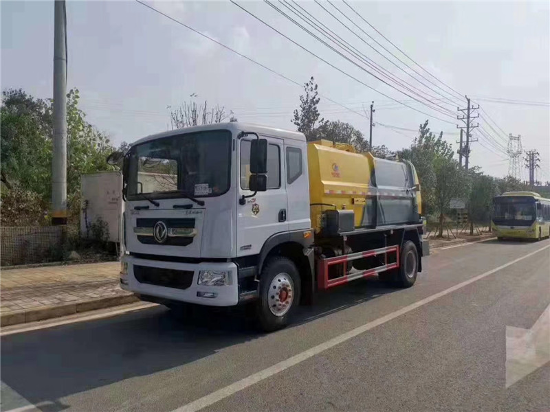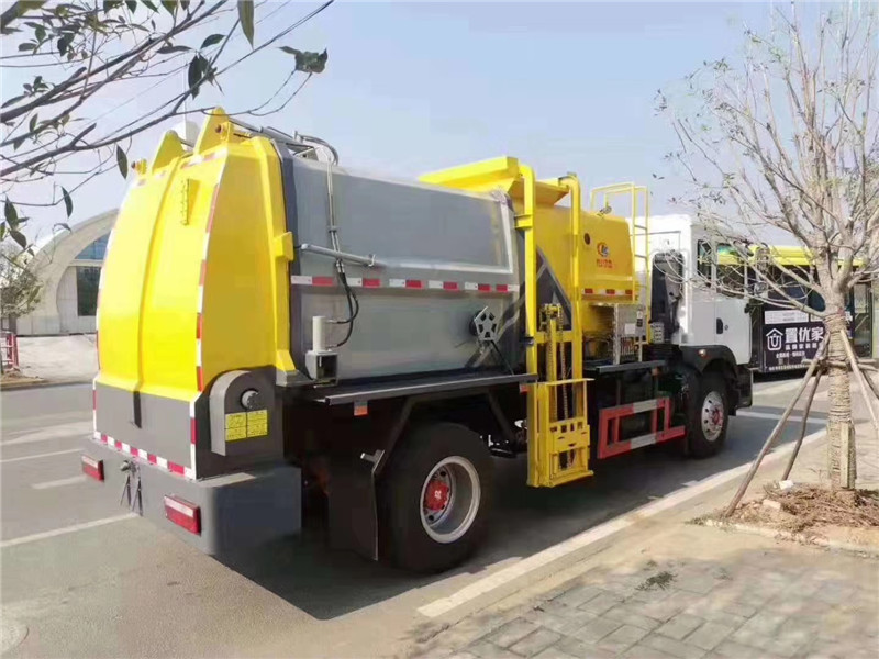 c、罐體容積8.5-10方,罐體帶舉升功能,后門液壓控制開啟關閉,帶液壓鎖緊功能,拉桿提升機聯動頂蓋完美設計,收集時滴水不漏。提升架可掛 120L/240L 標準塑料垃圾桶