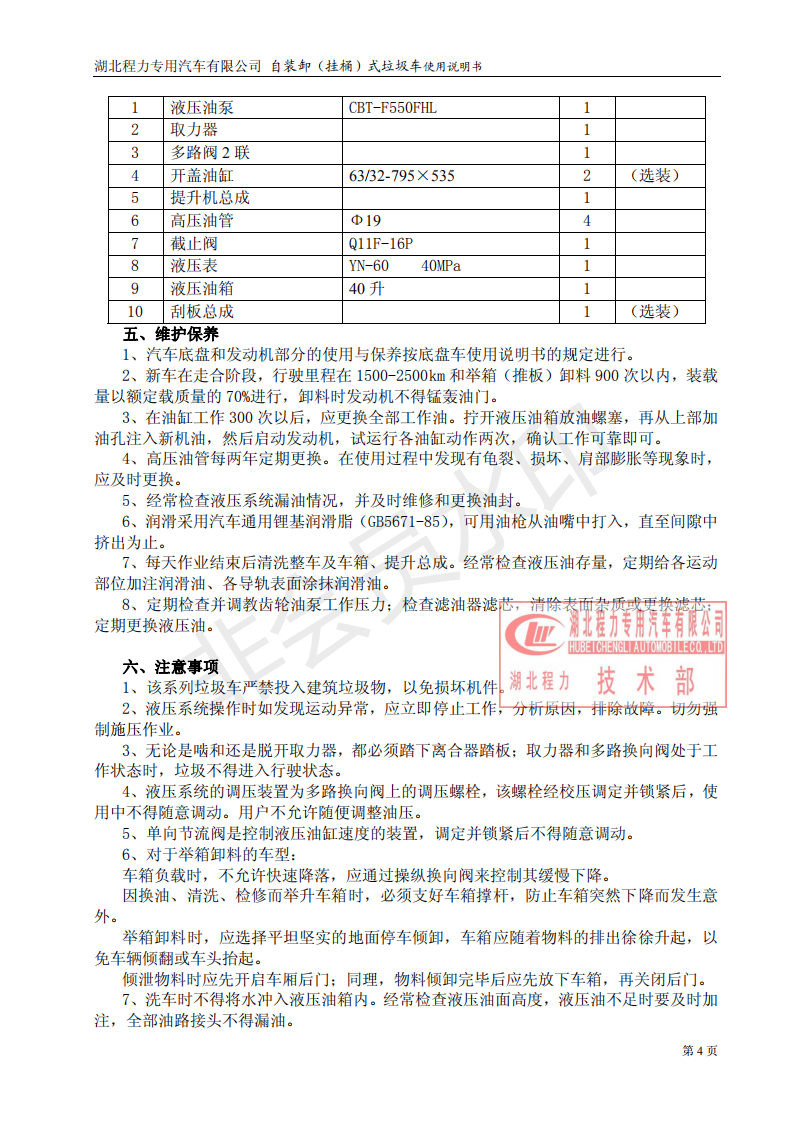 湖北程力專用汽車掛桶式垃圾車(以下簡稱掛桶式垃圾車或者勾臂式垃圾車)是用于城鎮(zhèn)內(nèi)的垃圾收集、轉(zhuǎn)運(yùn)、卸料作業(yè)的專用車輛。該車是由汽車底盤、自卸油缸、提升機(jī)總成、頂蓋(選裝)、附車架、垃圾箱體等組成。該車操作由液壓控制系統(tǒng)來完成,控制方式可以為手動或電氣控。該車主要用于城鎮(zhèn)垃圾的垃圾收集、轉(zhuǎn)運(yùn)和卸料。操作開提升控制閥將垃圾桶隨提升機(jī)向上升起并翻轉(zhuǎn)傾斜,桶內(nèi)垃圾被倒入車廂內(nèi)完成垃圾單次裝載,反向操作提升控制閥,垃圾桶隨提升機(jī)而放下;完成垃圾裝載后再進(jìn)行傾卸時,操作自卸控制閥,垃圾箱繞后翻轉(zhuǎn)軸傾斜體舉,箱體后門打開,垃圾傾卸出箱體;起該車由液壓控制系統(tǒng)來完成該車的提升機(jī)的上升和下降及垃圾的自卸功能,降低了工人的勞動強(qiáng)度和改善了工作環(huán)境。該垃圾車的收運(yùn)方式是目前國內(nèi)泛采用的垃圾收集轉(zhuǎn)運(yùn)方式,其專用裝置的功能均以汽車發(fā)動機(jī)為動力,通過液壓機(jī)構(gòu)手動或電控、氣控來實(shí)現(xiàn)。車輛的箱體采用優(yōu)質(zhì)炭鋼板全密封焊接結(jié)構(gòu),具有強(qiáng)度高、重量輕,防塵、防溢不產(chǎn)生二次污染等優(yōu)點(diǎn)。垃圾車整車基本性能與原底盤車相同,用戶請參閱原底盤車使用手冊。本用說明書僅介紹專用改裝部分的有關(guān)操作、檢查和維修保養(yǎng)。在使用車輛前,我們強(qiáng)烈要求您能夠通讀本說明書,并對其中的操作程序做到得心應(yīng)手。我廠對產(chǎn)品將會進(jìn)一步改進(jìn)。產(chǎn)品的改進(jìn)、性能的提高、結(jié)構(gòu)的不斷完善恕不另行通知,從而有某些說明不適用于您的特定車輛,敬請諒解。下面是湖北程力自裝卸式垃圾車(掛桶式垃圾車)使用說明書:![]() ![]() ![]() ![]() ![]() ![]() |