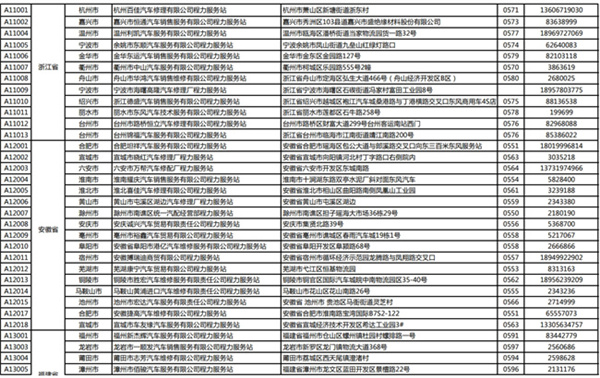 汽車浙江省、安徽省、福建省服務站通訊錄:
