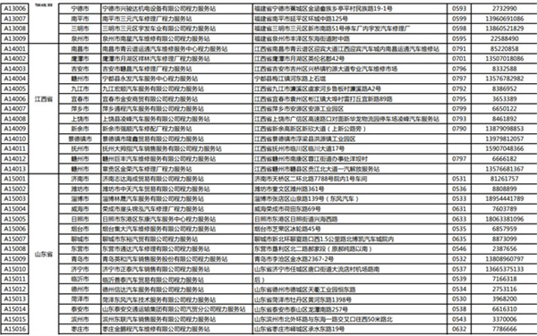 汽車福建省、江西省、山東省服務站通訊錄: