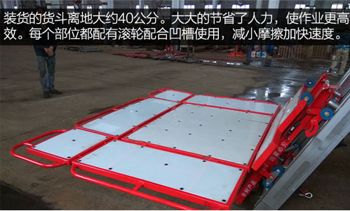 裝貨的貨斗離地大約40公分。大大的節省了人力,使作業更高效。每個部位都配有滾輪配合凹槽使用,減小摩擦加快速度。