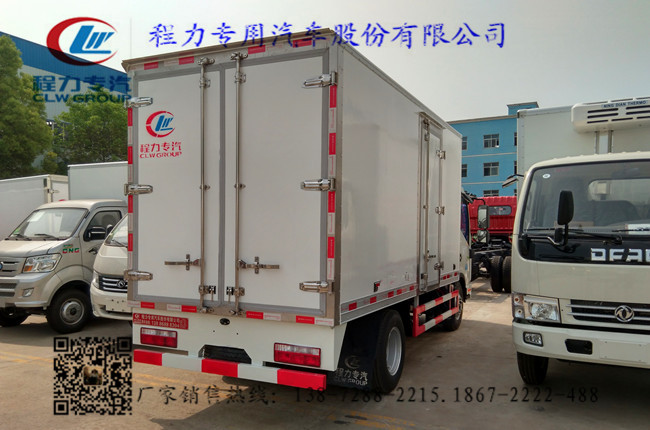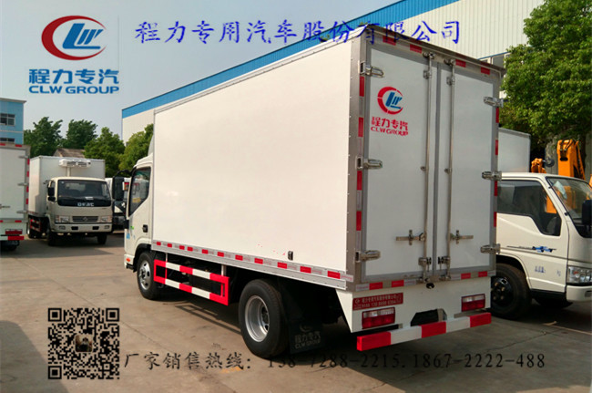 2.上裝配置:廂體內部有效尺寸:單排長4.015米(排半長3.685米)×寬1.9米×高2.0米,廂體蒙皮采用內外玻璃鋼,隨客戶選擇內置槽鋼焊接骨架或者玻璃纖維超輕高強度骨架,填充8cm聚氨酯保溫層,不銹鋼包角,不銹鋼門框,不銹鋼門鎖件,防滑花紋鋁底板,配后雙開門,車廂右側可以加開側門,-5~-18度制冷機組