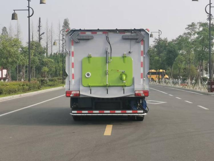 洗掃車采用中置兩刷盤,中置寬吸盤,配上具有防撞避障功能的V型高壓沖水架,組成一條大于3.5米的沖洗清掃帶。采用康明斯EQ6BT5.9-118型副發動機作為動力的驅動裝置橫置在車架中部,具有氣動離合裝置控制的抽吸風機布置在動力倉的左側。采用不銹鋼材料加工而成的水箱與垃圾箱均為采用方形瓦棱結構。水箱分為兩部位,一部分為前置獨立水箱,裝配在動力倉的前部;另一部分為設置在垃圾箱前部的水箱,可隨垃圾箱與動力倉罩同時升降。具有舉升功能的垃圾箱內裝配有高壓沖洗噴頭,使得卸料更為輕松、干凈。能夠隨垃圾箱體舉升的動力倉罩可使動力系統的維修保養極為便利。采用歐美地區的名優配套部件,使得整車性能更為優良,工作更為可靠。