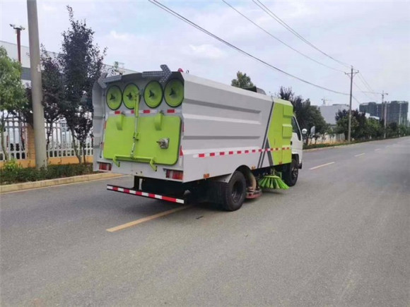 尾部的防護杠其它是一組噴頭,在吸完路渣后,對道路噴水降塵降溫處理。9. 整個車身在吸盤位置和尾部都安裝了夜間工作用的照明燈和監視攝像頭,增強的掃路車的夜間工作能力,而且實現了駕駛室監控清掃情況,