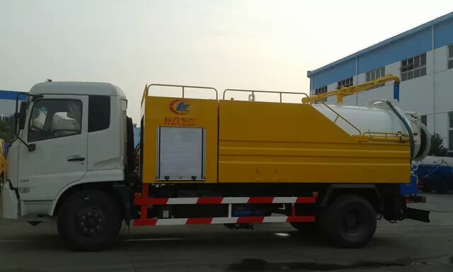 5】程力吸污車具有液壓舉升自卸功能,便于將各種污泥傾倒干凈。而且后罐門可以液壓自動開啟,便于清理罐體內的沉積物、凝固物及對罐體內部進行維修、保養。
